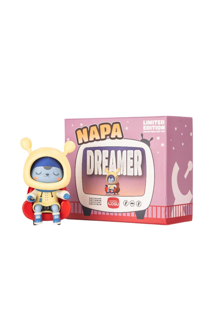 In classic a white and blue varsity jacket, Napa rests with eyes gently closed atop a bold red couch—a design that channels the power of daring to dream differently. A portion of the proceeds behind this piece goes towards a charitable initiative close to our hearts.